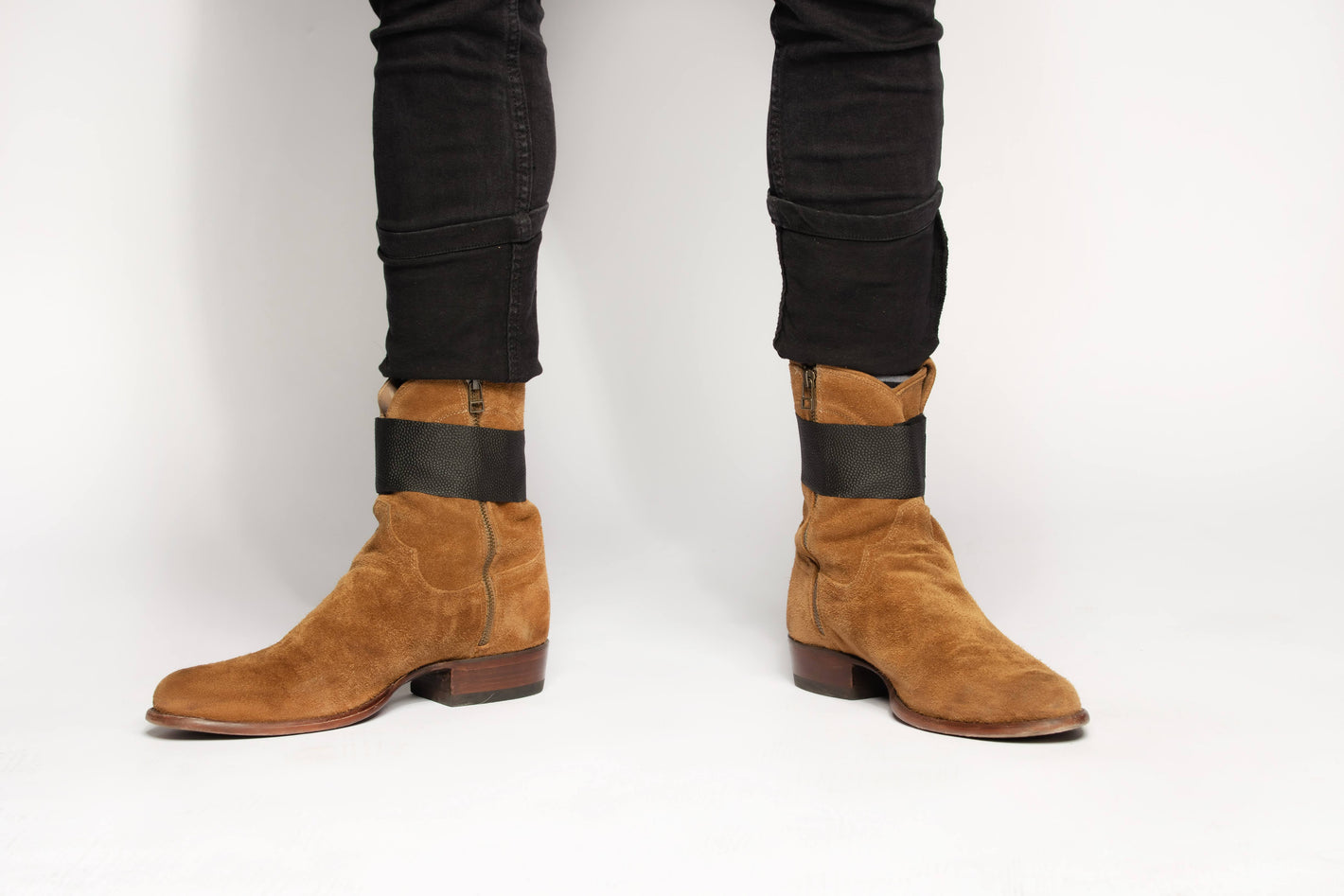 This patented Texas made product includes two highly durable straps made of a non-slip rubber top layer with a smooth polyester backing that gives you the option to wear wider shaft boots with slim fitting pants that not only eliminates the printing of the boot shaft on the pants, but also keeps the pants from riding up when walking or sitting.